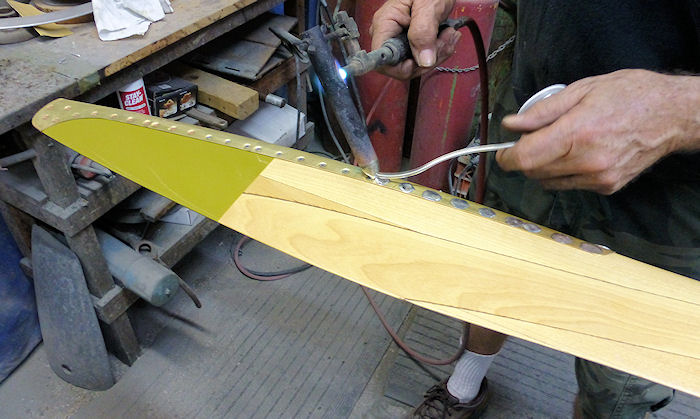 the metal leading edge to the wood. Then solder is melted over
